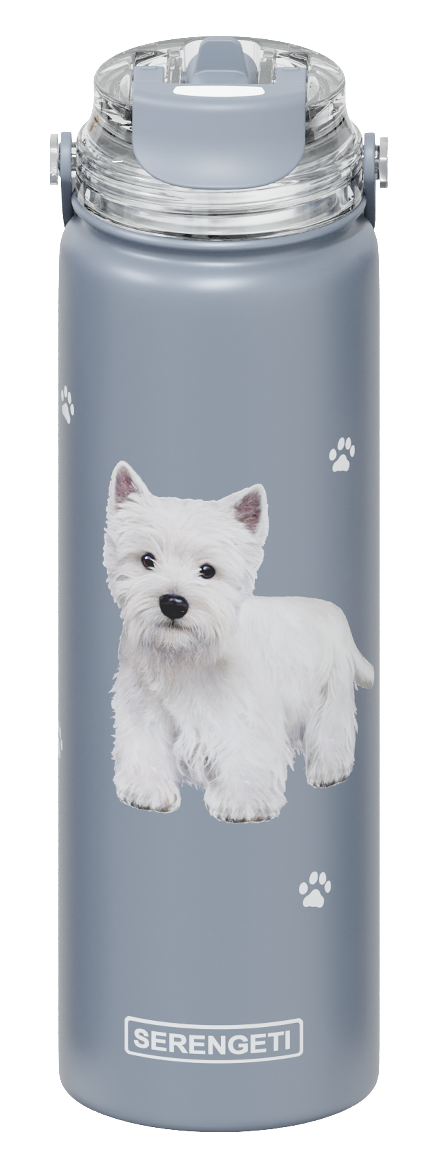 Why not try one of our West Highland White Serengeti Water Bottles. This beautiful unit is spill proof and has a sliding top lid with a twist-on cap. It is insulated and has a vacuum sealed double wall, keeping your cold drinks cold for several hours.